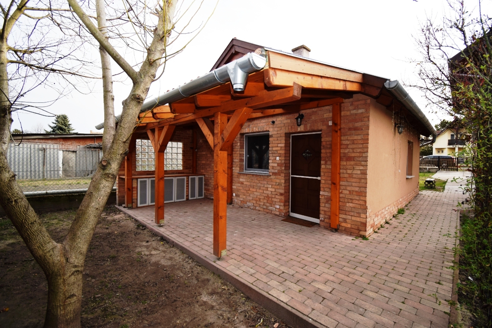 A ház bejáratánál egy nagyon szép terasz kapott helyet, konyhapulttal (LED-es hangulatvilágítással), így kint lehet sütögetni, pihenni.