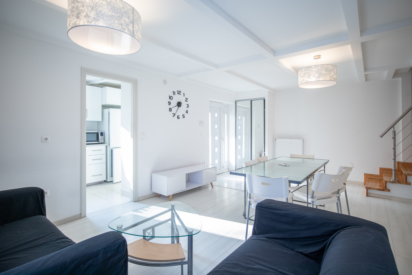 An interior two-story apartment awaits its new tenants, who are looking for a stylish and practical home for their family in a quiet, orderly neighborhood.